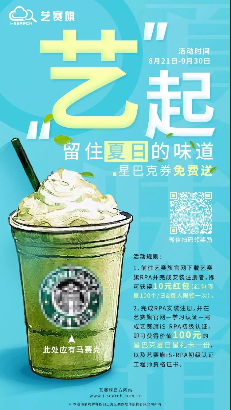 (2)完成RPA安装注册,并在艺赛旗官网—学习认证—完成艺赛旗iS-RPA初级认证,即可获得价值100元的星巴克夏日星礼卡一份以及艺赛旗iS-RPA初级认证工程师资格证书。