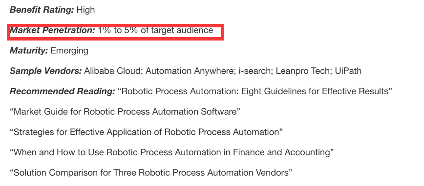 其实RPA在全球都还没有实现大规模应用,欧美和日本的普及率不到20%,在Gartner 报告中,中国市场的RPA渗透率只有1-5%。