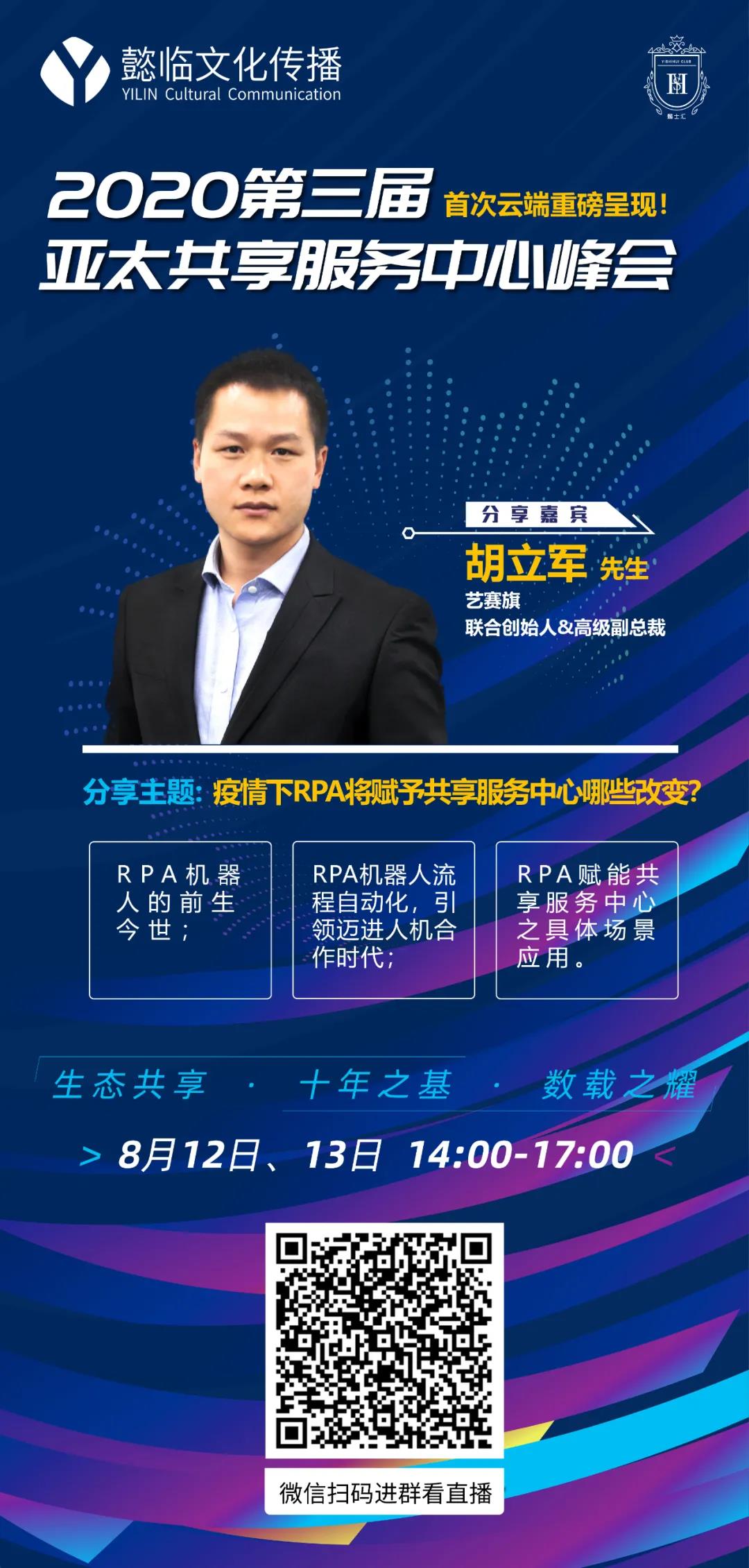 RPA——企业智能化升级的加速引擎。8月13日,艺赛旗联合创始人&高级副总裁胡立军将为您带来主题为:“疫情下RPA将赋予财务中心哪些改变。”的分享。