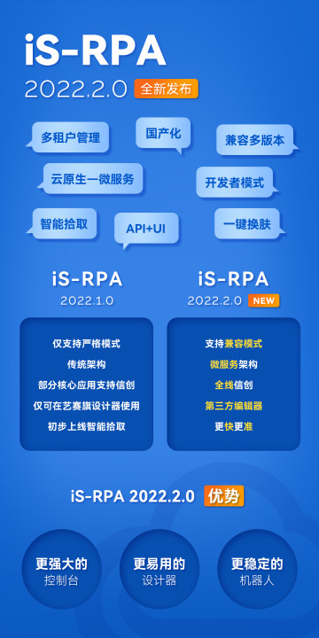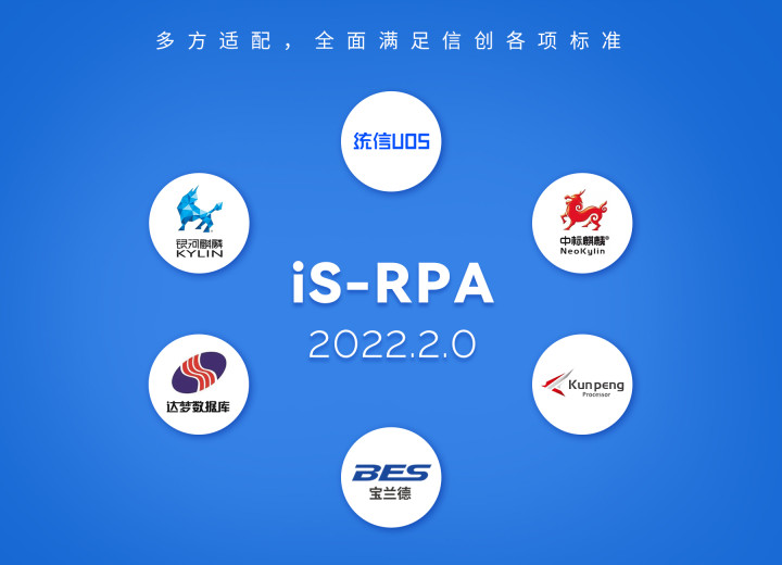 iS-RPA 2022.2.0 版本全新推出信创版设计器、机器人。自动化平台同步适配国产化系统,信创能力全方面提高。