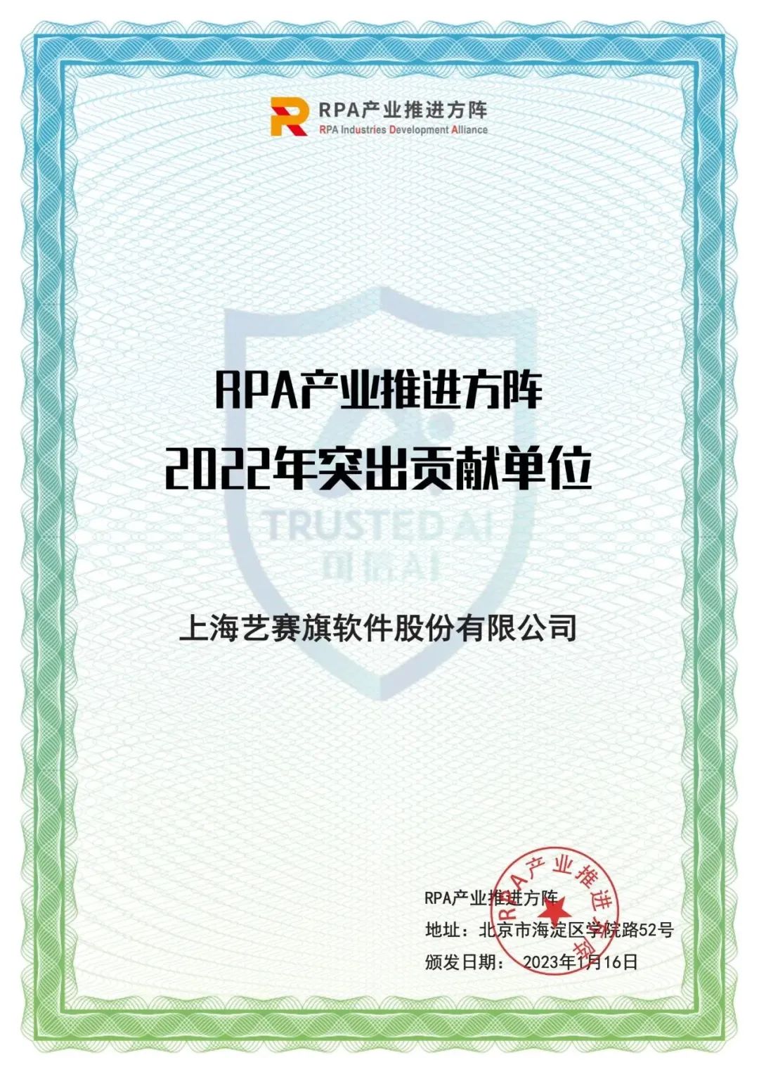 近日,RPA产业推进方阵正式公布“2022年突出贡献单位”名单,以此表彰在2022年度中,为方阵组织的标准制定、产业活动、研报撰写、评估测试等工作做出突出贡献的企业。艺赛旗凭借在过去一年为方阵组织以及RPA行业做出的卓越贡献,荣膺RPA产业推进方阵“2022年突出贡献单位”。
