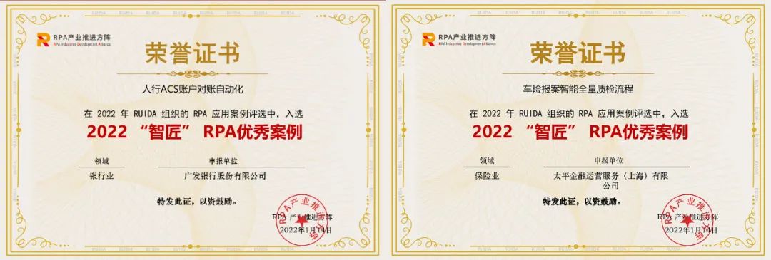 2022年1月14日,中国信通院线上召开了“2021年可信AI成果发布会”,会上发布了备受瞩目的RPA系统和工具应用成熟度第三轮评估结果,并正式揭晓了“智匠”案例第二轮入围结果。艺赛旗客户太平金融运营服务(上海)有限公司、广发银行股份有限公司申报的两项RPA案例入选第二轮2022RPA“智匠”应用优秀案例。