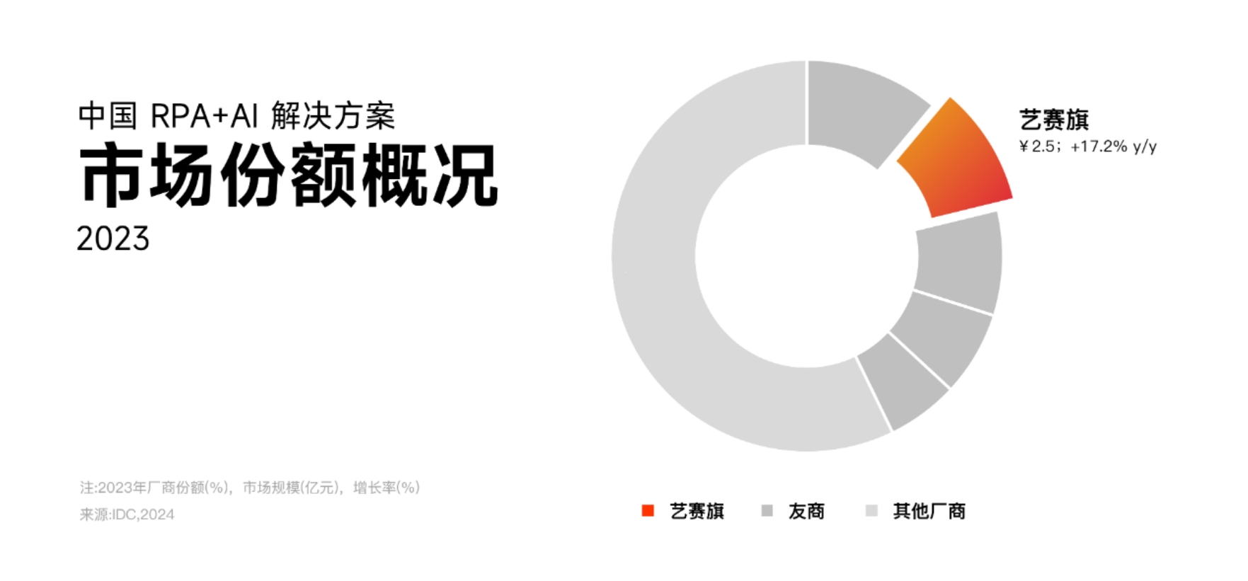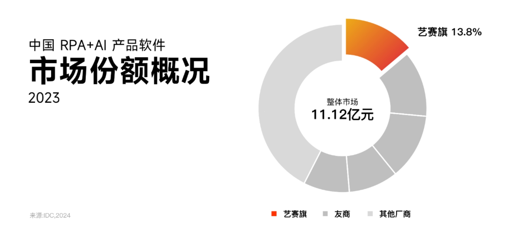 As a pioneer and leader in China's RPA track, Yisai Flag stands out in the fierce market competition and ranks second in the Chinese RPA+AI solution market with a market share of 10.1%! At the same time, it has taken the lead in the product software market with a market share of up to 13.8%, ranking first in the country in terms of market share!