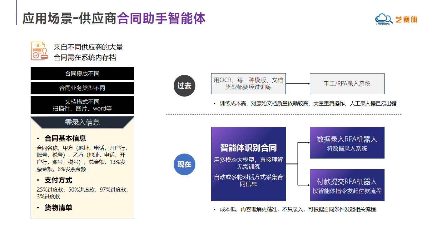 The supplier contract assistant intelligent agent adopts multimodal big model technology, which is different from traditional training modes. It can directly parse various contract contents, including different templates, business types, and document formats, without the need for specialized training. This intelligent agent can not only achieve high-precision content understanding at low cost, but also has basic input functions and can automatically trigger relevant business processes based on contract terms.
