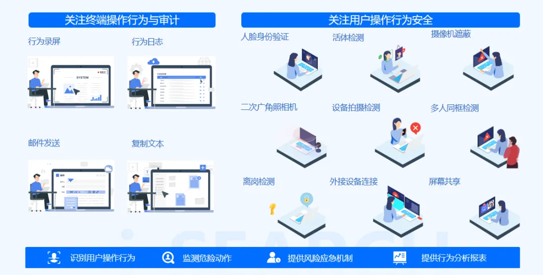The whole process behavior monitoring uses the camera to record the human behavior of employees when operating sensitive applications/Web pages, and automatically identify high-risk operations such as mobile phone shooting, copying, multiple people in the same frame, and leaving the post.