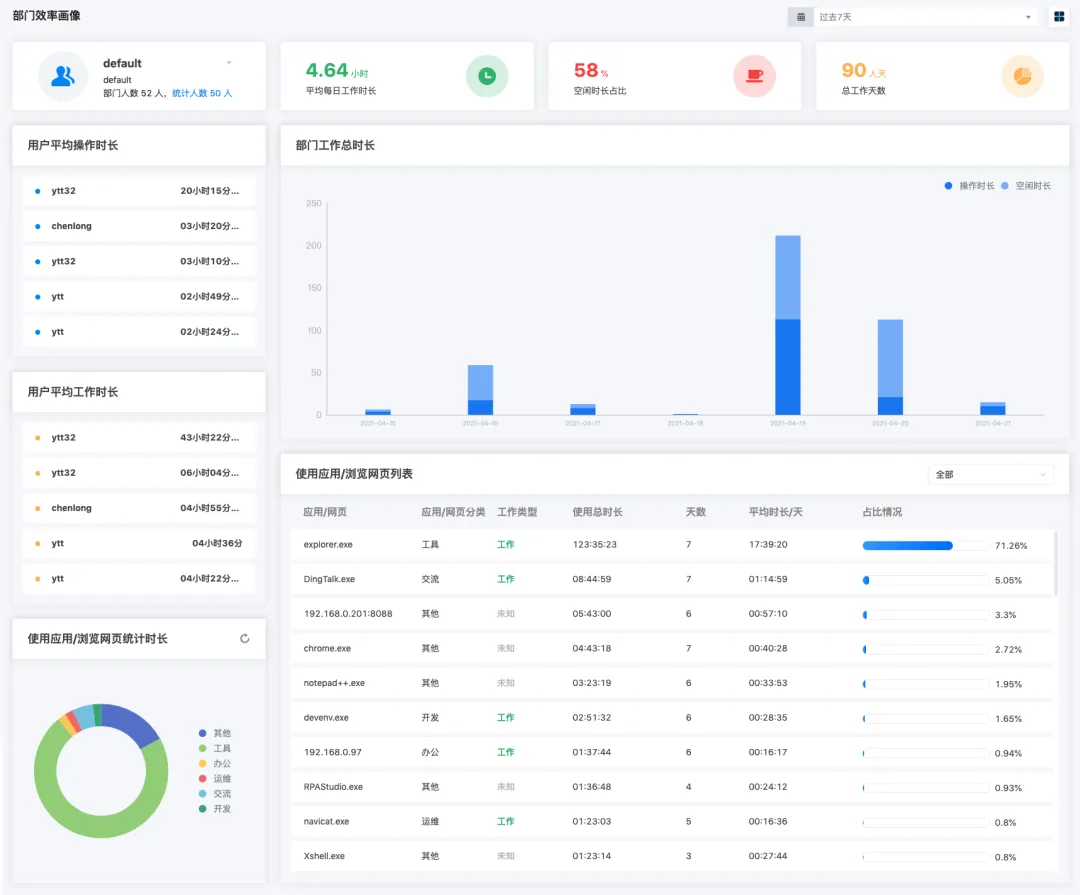 We are not only concerned about safety, but also committed to enabling business. Through the work efficiency portrait, employees' work efficiency can be evaluated from multiple dimensions. Provide objective basis for outsourcing settlement and performance appraisal scenarios, and provide efficiency optimization suggestions for managers.