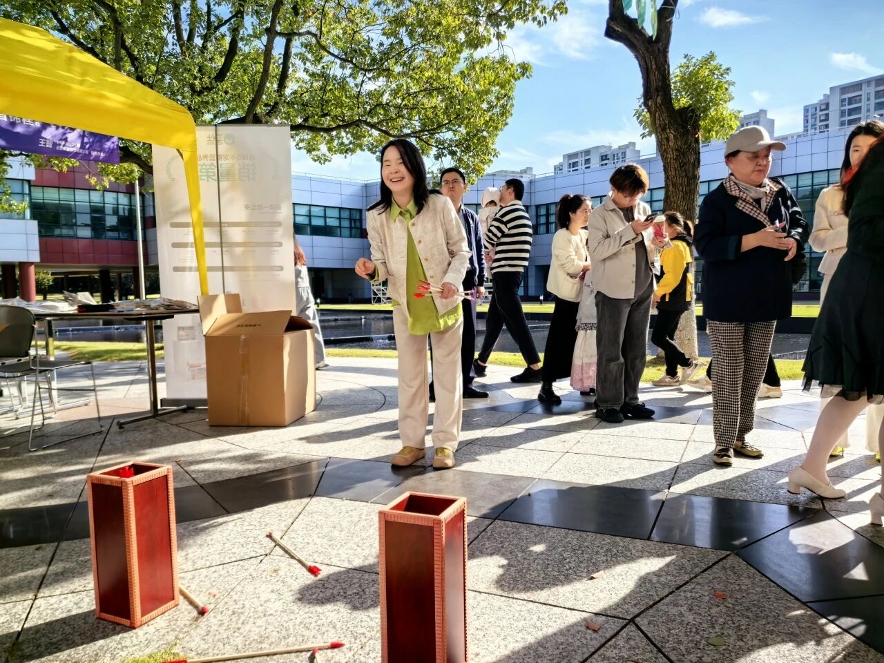 There were crowds in front of the exhibition area of the art competition flag in the market, and a unique throwing pot game attracted people to stop and watch. The throwing pot is a classic throwing game for ancient literati and bureaucrats at banquets. It is both entertaining and ceremonial. Players need to throw arrows into the pot from a specified distance, and the winner will be determined by the number of arrows. In order to fit the atmosphere of the market, the i-Search simplified the rules: each person can receive 10 arrows, throw at the starting point 1.5 meters away, and win customized peripheral and exquisite gifts as long as 3 arrows are successfully invested.