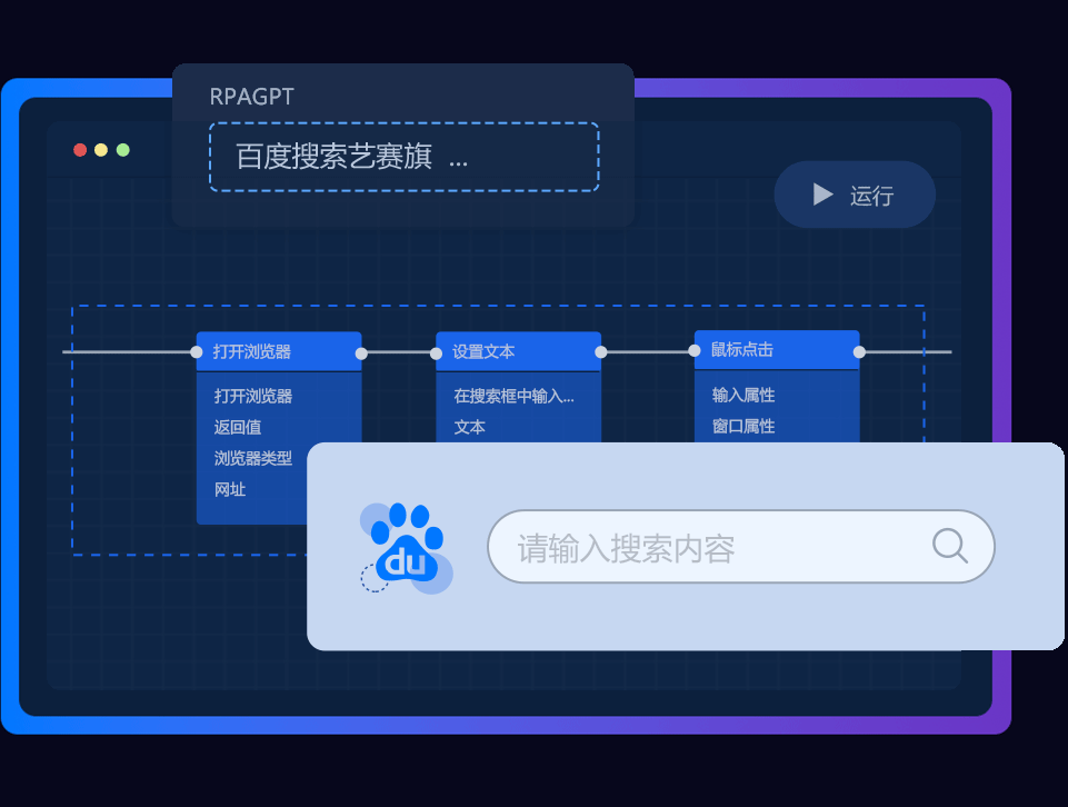 查看客户案例它为每个人提供了适用于自身的强大功能,易于上手,便于协作,能够支撑RPA项目快速落地。业务人员只要说出需求,系统就能自动生成流程;开发人员完全拖拉拽操作,丰富内置+自定义组件充分满足开发需求;高级开发者可以无缝打开PyCharm、VsCode,更有调试和Git等高阶功能,效率倍增;运维管理人员可以使用开放API接口打通多个系统,设计器支持Windows和UOS平台安装,且可以统一管理,灵活、安全、可控。