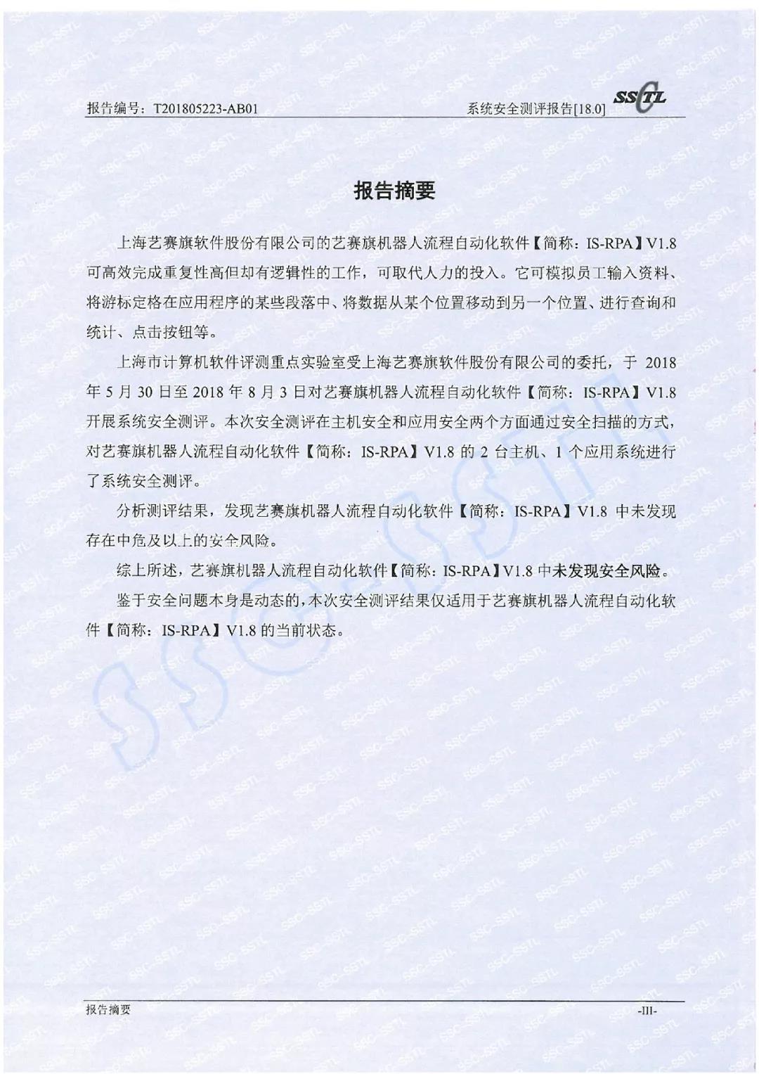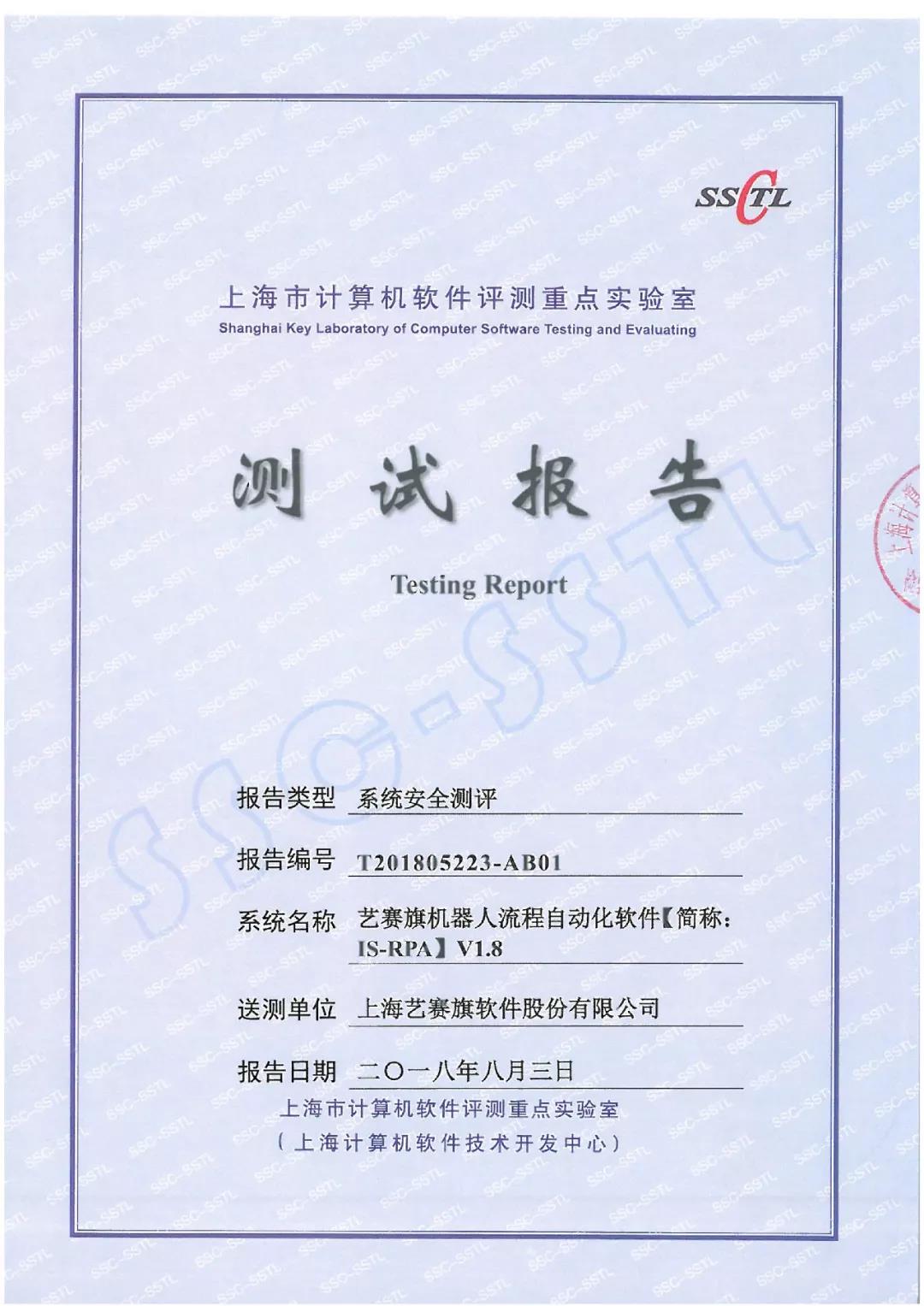 近期,艺赛旗委托“上海市计算机软件评测重点实验室”(SSTL)对iS-RPA开展全面的系统及应用安全相关评测。