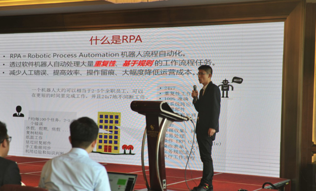 随后,艺赛旗副总裁胡立军先生为大家分享 “RPA行业风口及应用”。胡总解读了本次会议背景:在苏州、上海、南京艺赛旗已经召开了三届研讨会,未来在广州、北京类似的研讨会,将陆续召开。胡总为大家分享了RPA在国内外行业现状。目前,艺赛旗已打造了完善的RPA生态圈:在培训体系搭建、行业开放式交流、终端实施部署、产学研机构合作、第三方接口等方面做了全面部署。未来,像艺赛旗RPA一样拥有自主产权的国产人工智能产品,必将大有可为。