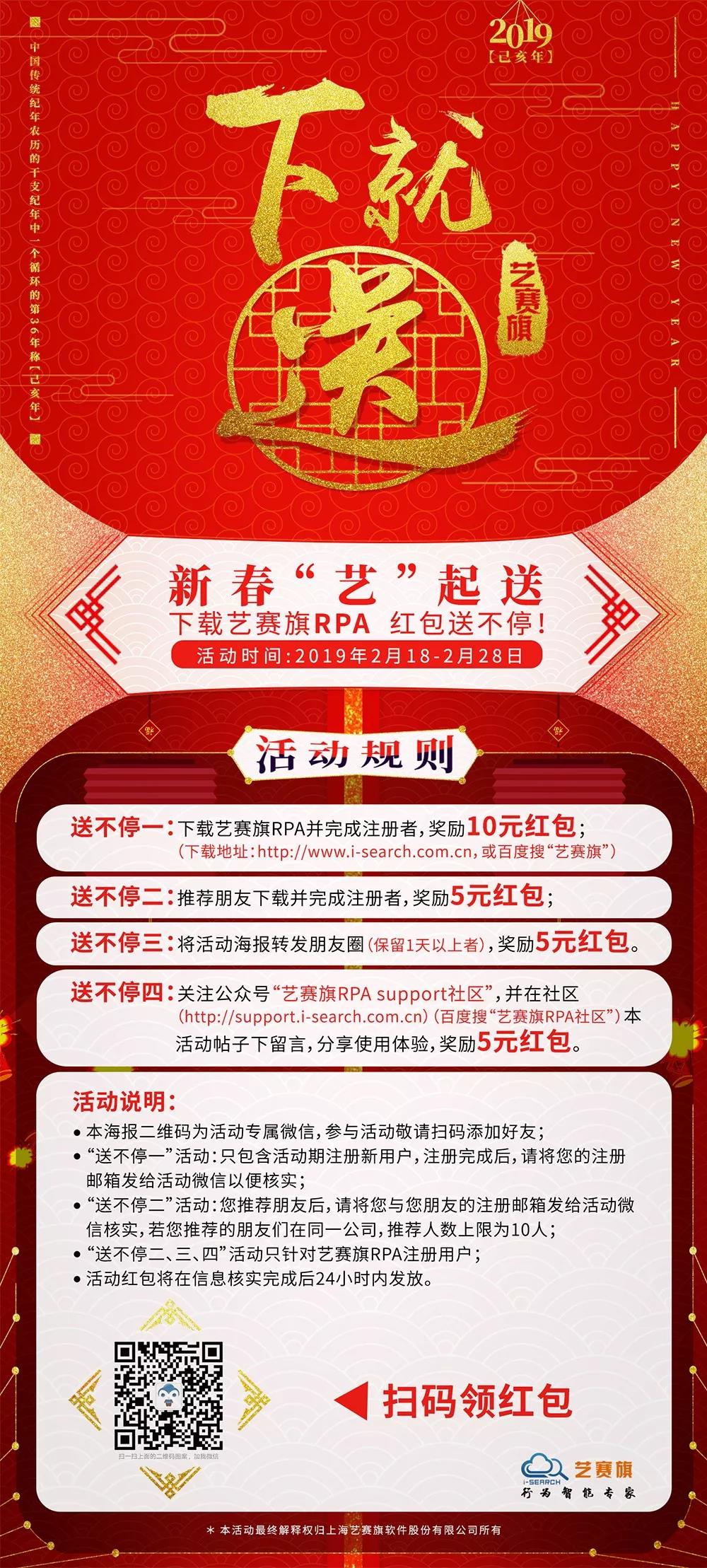 送不停一:下载艺赛旗RPA并完成注册者,奖励10元红包;
