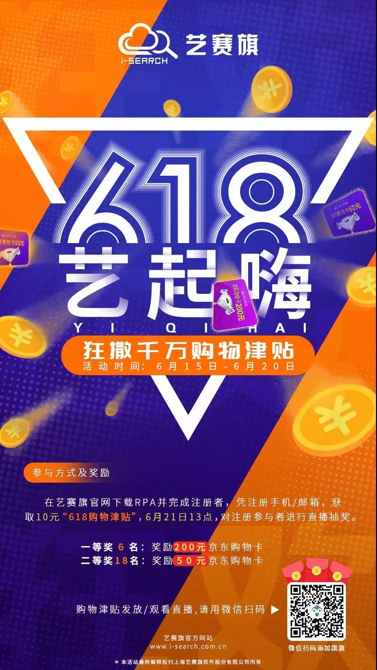 1、凡在艺赛旗官网下载RPA并完成注册者,凭注册手机/邮箱,即获取10元618购物补贴(网页搜艺赛旗即可直接下载)。