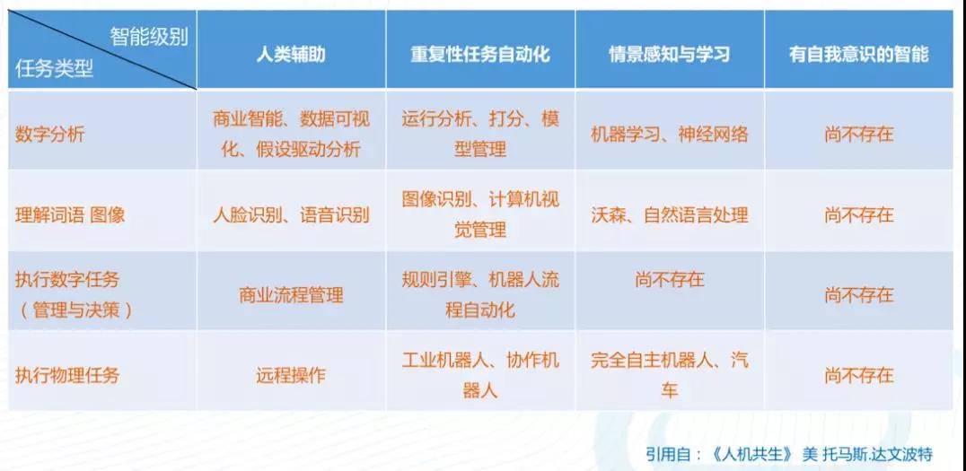 全球顶尖的商业思想家托马斯·达文波特(Thomas H.Davenport),更是呕心沥血,前瞻性的提出了人类与机器的合理融合方式——《人机共生》。给出人来智能时代胜出的策略。同时这位思想家给出的“认知智能的类型及其复杂度”模型如下: