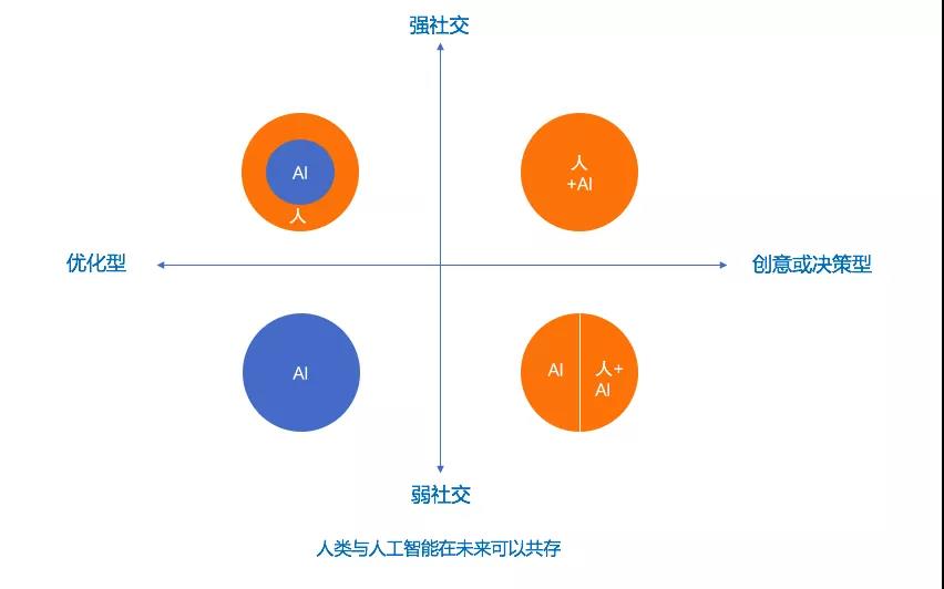 李开复老师在《AI.未来》一书中,也指出,未来人机共存的形式为“优化与人情”:其主要核心思想为,由人工智能负责例行的、重复性的优化任务,人类负责需要创意和战略思维的工作和处理人际关系。这样会需要重新调整很多岗位,也会创造新的工作,让人类和机器联手提高高效率且人性化的优质服务。