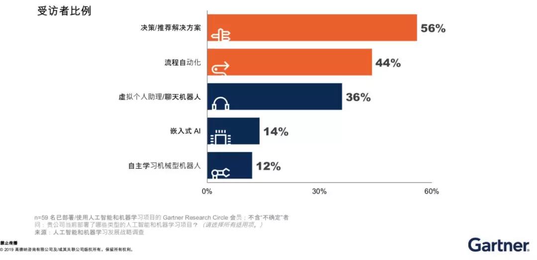 以上以自动化技术服务于人类生产劳动的产品在当下非常流行,标准名称为RPA(Robotic Process Automation)机器人流程自动化软件,这种产品非常受欢迎,银行,可用于顾客后台的服务任务,如自动化办理挂失、补卡的业务,保险,如处理申报和赔付,供应链管理,如处理发票,回应来自顾客和供应者的日常请求,IT技术维护,如监控系统错误信息、以及修复故障问题等等。RPA以其新一代的应用场景,精准、零错误、高效率、高ROI等特性,形成了巨大的性能增益,为各行各业降本增效的首选解决方案。通过大量的案例实施标明,RPA有效服务于各行各业的场景达到100万种事务之多,提升业务满意度80%以上、提升科技体验度90%以上,总体投资回报率达到800%。由于RPA在适当的场景下可以对接和采用非常多的AI技术,如OCR、NLP、ML、语音、FACE ID等,所以称为了名副其实的AI增强人类能力的典范。据Gartner调研数据表明,全球拥有44%以上的CIO及企业雇主正在采用流程自动化解决方案,并以AI增强的方式逐步加大解决方案的引入。