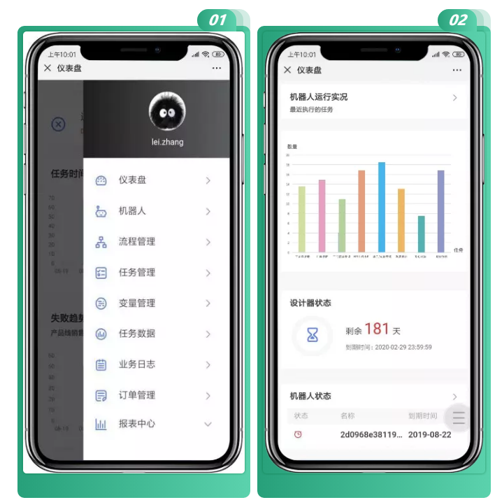 2、移动端随时检测:在RPA10.0中,RPA更富于生活化,在手机端微信小程序中可以全面检测RPA机器人的运转。
