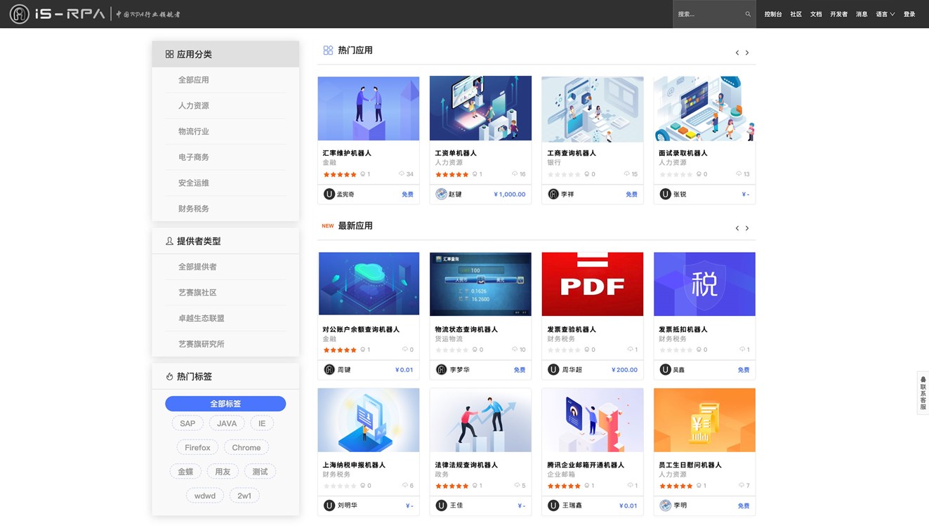 “艺赛旗RPA应用机器人商城——不止于商城,更是一个生态”:在线培训、在线学习、在线认证、在线购买等一应俱全,为众多RPA客户和众多开发者提供了互通、互动、订购、开发的平台。