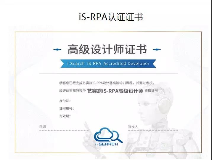 参加培训,认真学习,并通过考核者,我们会线上颁发线上iS-RPA高级设计师证书。