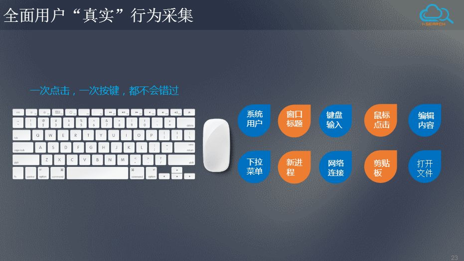 捕获大量细致的标识操作动作,并形成文本元数据,把终端桌面上的用户行为分解成详细的日志记录保存下来,例如打开的窗口标题、打开的文件、键盘的输入、鼠标的点击、网络的连接、聊天的记录、文件的操作等,UEBA 在这些丰富的文本数据基础上,即可应用智能化的分析处理技术,极大提高审计工作的可操作性。用户也可按照需求配置选择需要抓取的文本数据类型,避免无用数据的干扰。