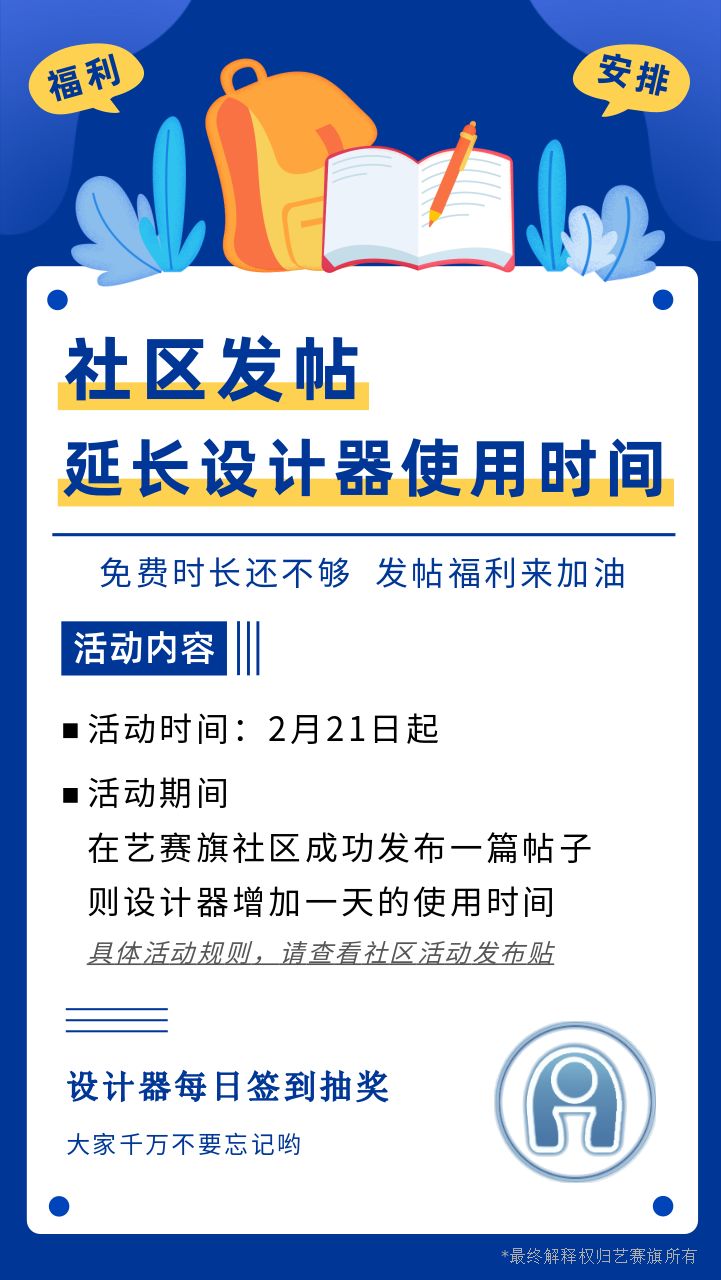 艺赛旗社区又为大家准备了“社区发帖,延长设计器使用时间”活动,大家可以点击阅读原文进社区参与活动。