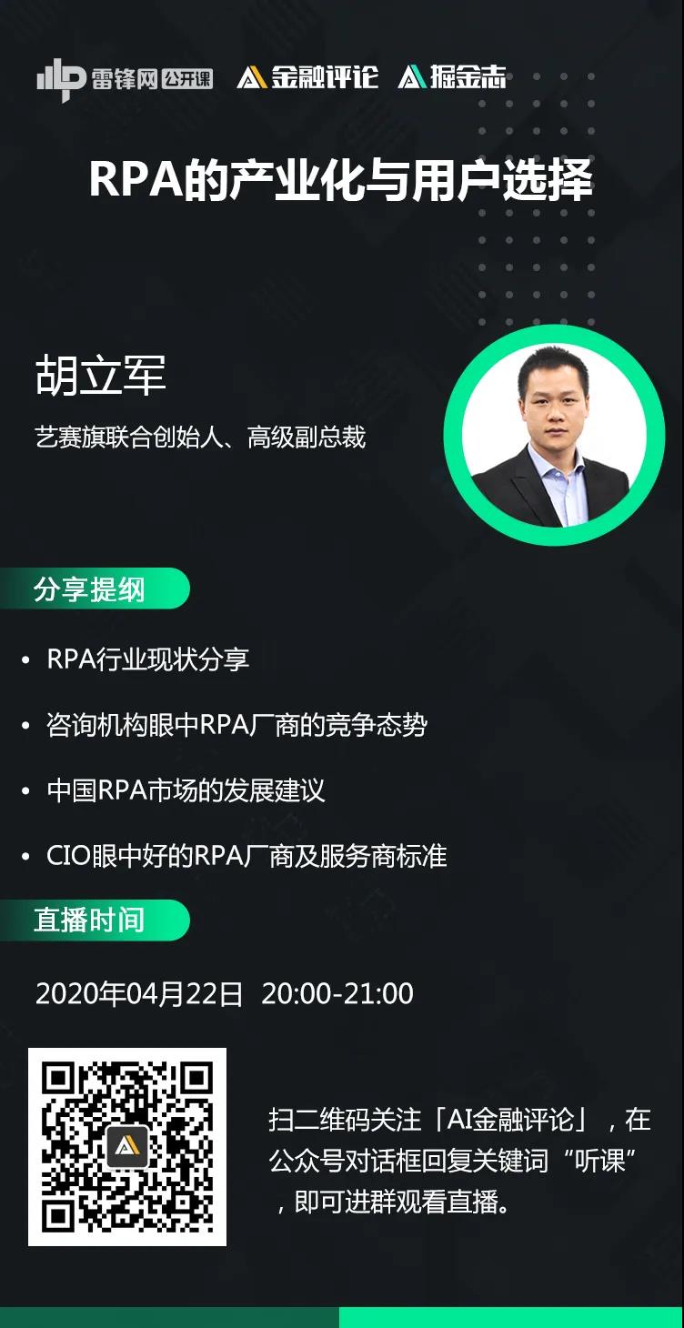 (此外,胡立军将于4月22日做客雷锋网「RPA+AI 高管公开课」,进行1小时的深度分享,扫文章底部海报二维码进群听课。)