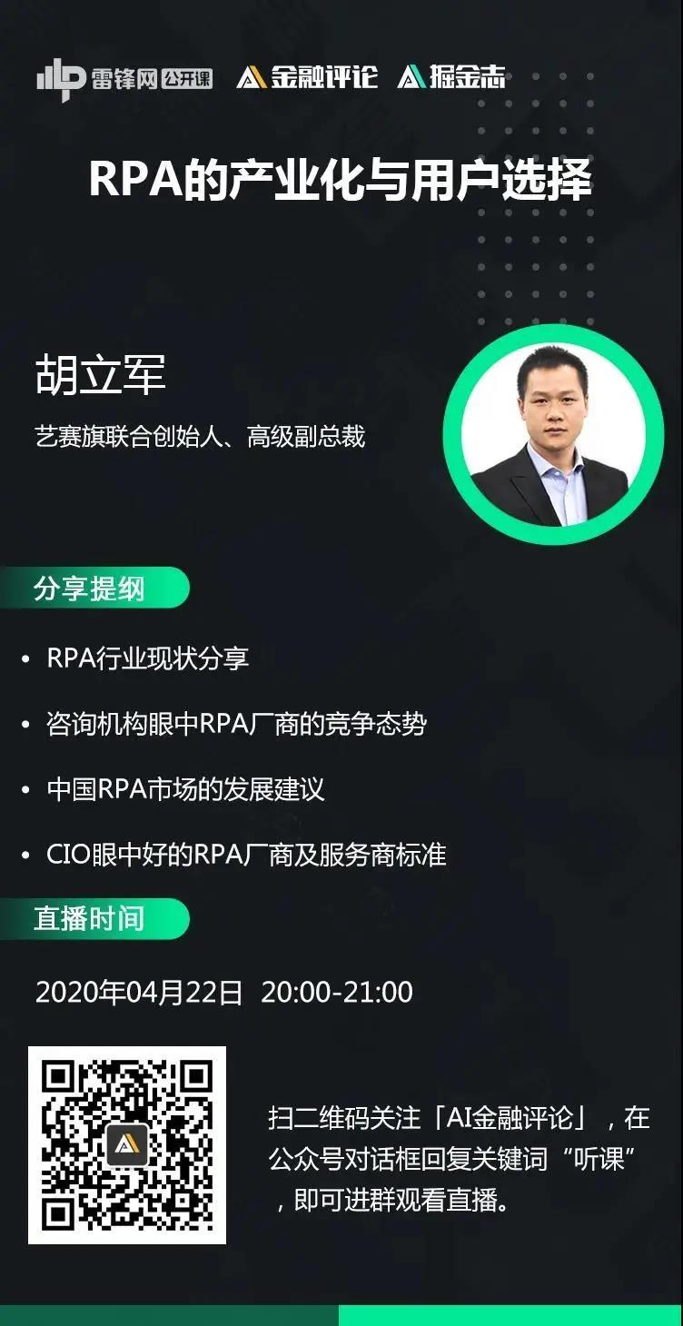 这一系列对RPA翘首以盼的伙伴们关心的问题都将在——4月22日晚8点,艺赛旗联合创始人&高级副总裁胡立军,将做客雷锋网,以他最纯粹的前瞻性思考,直面当下的思维困境,为我们讲述——RPA的产业化与CIO选择。