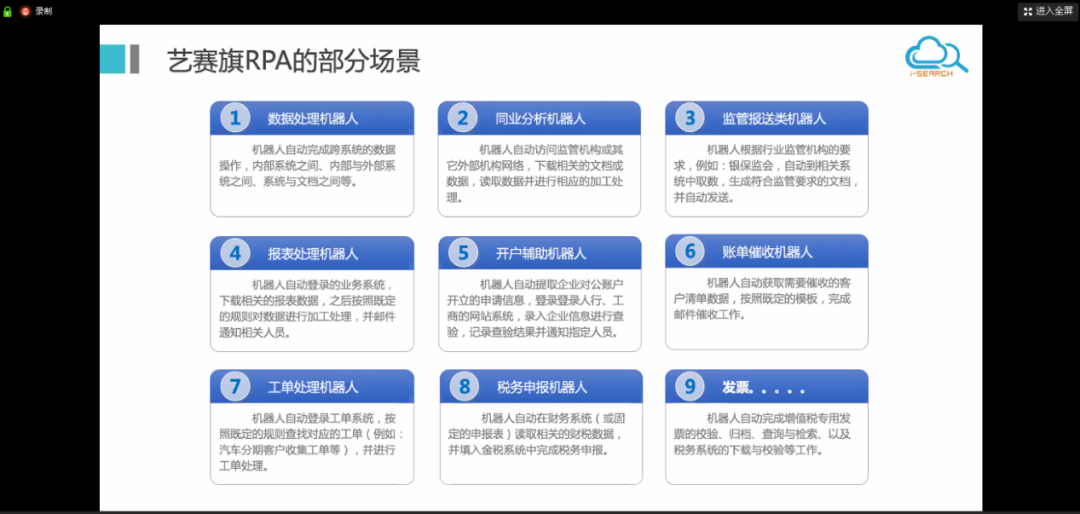 2020年4月29日,艺赛旗与金牌合作伙伴东软云科技,充分整合双方丰富的RPA案例经验和专业的师资力量,针对RPA(机器人流程自动化)技术在金融行业的业务场景和应用,开展了一场别开生面的线上培训。