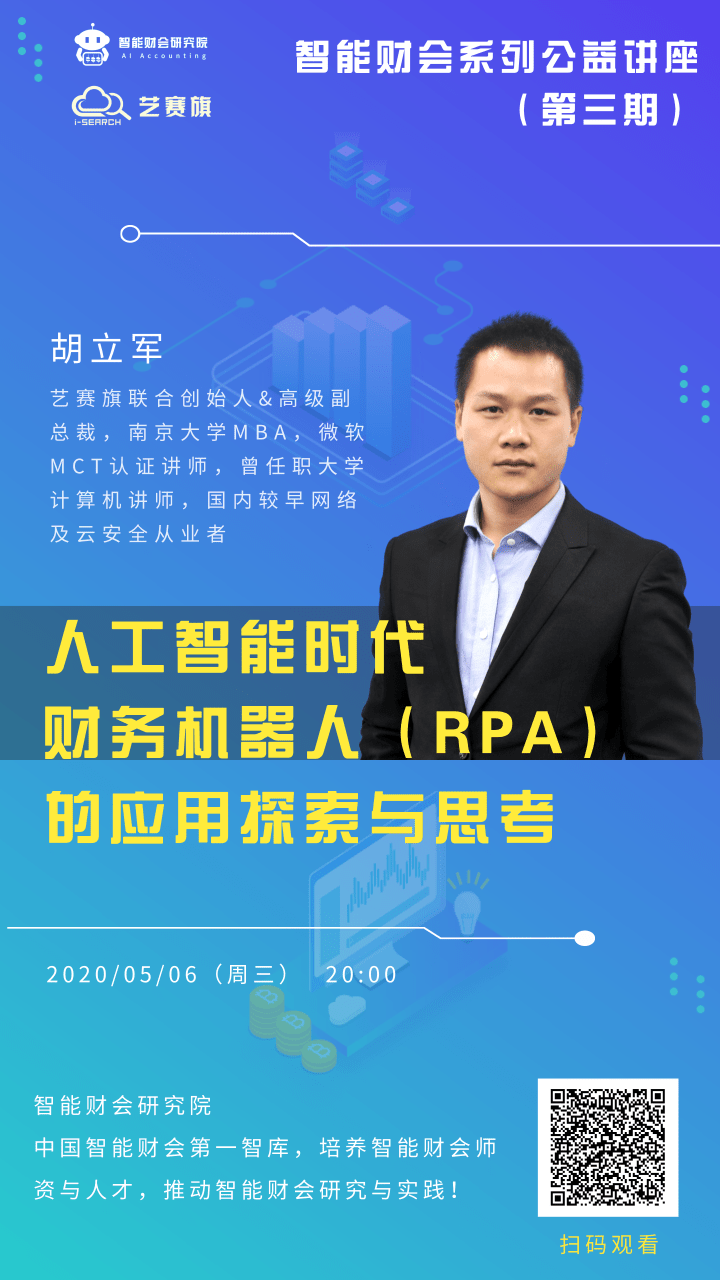 中国RPA行业领军企业——艺赛旗联合创始人&高级副总裁胡立军受邀分享《人工智能时代财务机器人(RPA)的应用探索与思考》——带你了解人工智能时代AI与财务机器人的最新风向标!敬请收看!