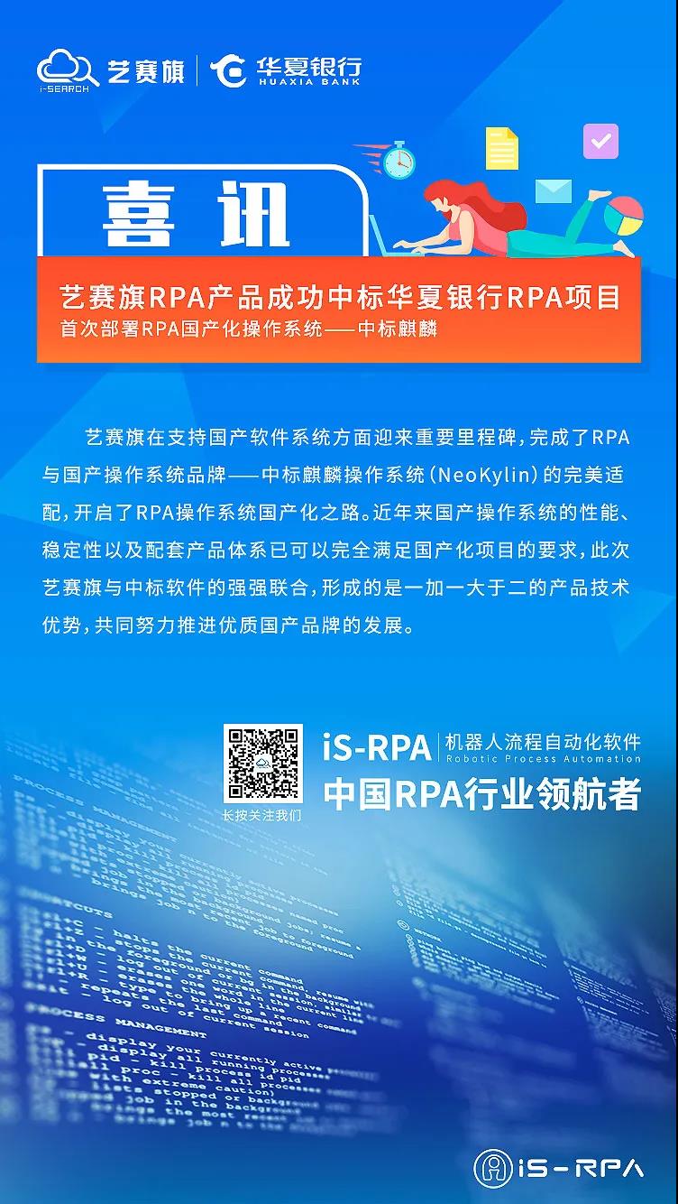 继成功签约华夏银行成都分行后,近期,艺赛旗再传喜讯,成功签约华夏银行“2019机器人流程自动化项目”。此项目由华夏总行运营管理部牵头,覆盖全行各业务条线。