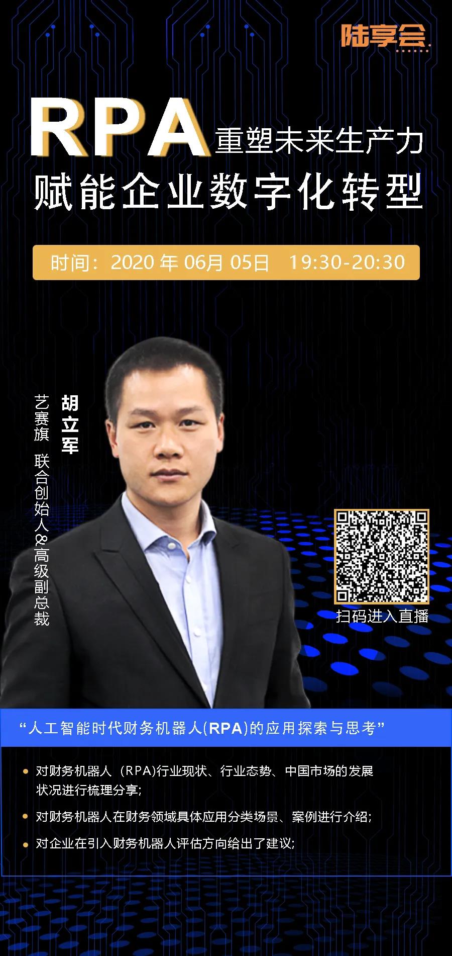 那么人工智能时代下企业如何开启财务数字化之路?财务机器人在中国市场未来发展趋势如何?6月5日(本周五)晚19:30,艺赛旗&陆享会联合举办主题为“RPA重塑未来生产力”的直播,邀您一起探讨财务机器人赋能企业数字化之路。