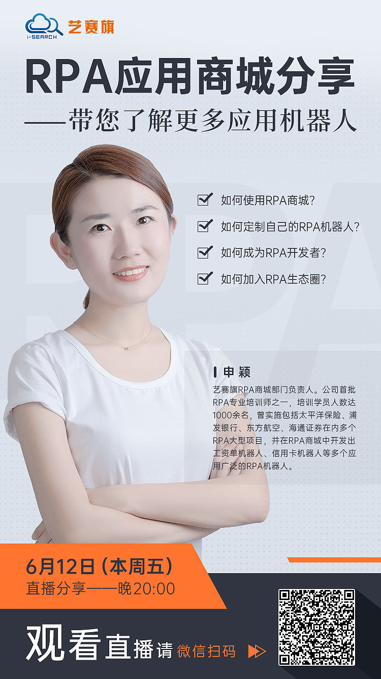 今晚8点,听艺赛旗RPA商城负责人——美女讲师申老师为我们带来RPA应用商城分享,系统的为大家介绍商城及机器人,欢迎围观!