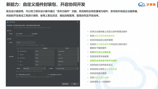 4、 新能力:iS-RPA2020.3.0的设计器功能更加强大,新增了自助保存组件功能,让组件呈现工厂化模块,在支持远程发布的同时还能够兼顾原有工程。全方位考虑到用户、设计开发者、使用者等多方面需求。