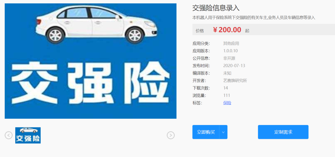 在6月份,通过艺赛旗RPA机器人商城场景收集的征集需求,RPA商城团队和合作伙伴一起完成了某保险公司“RPA交强险机器人”的定制。