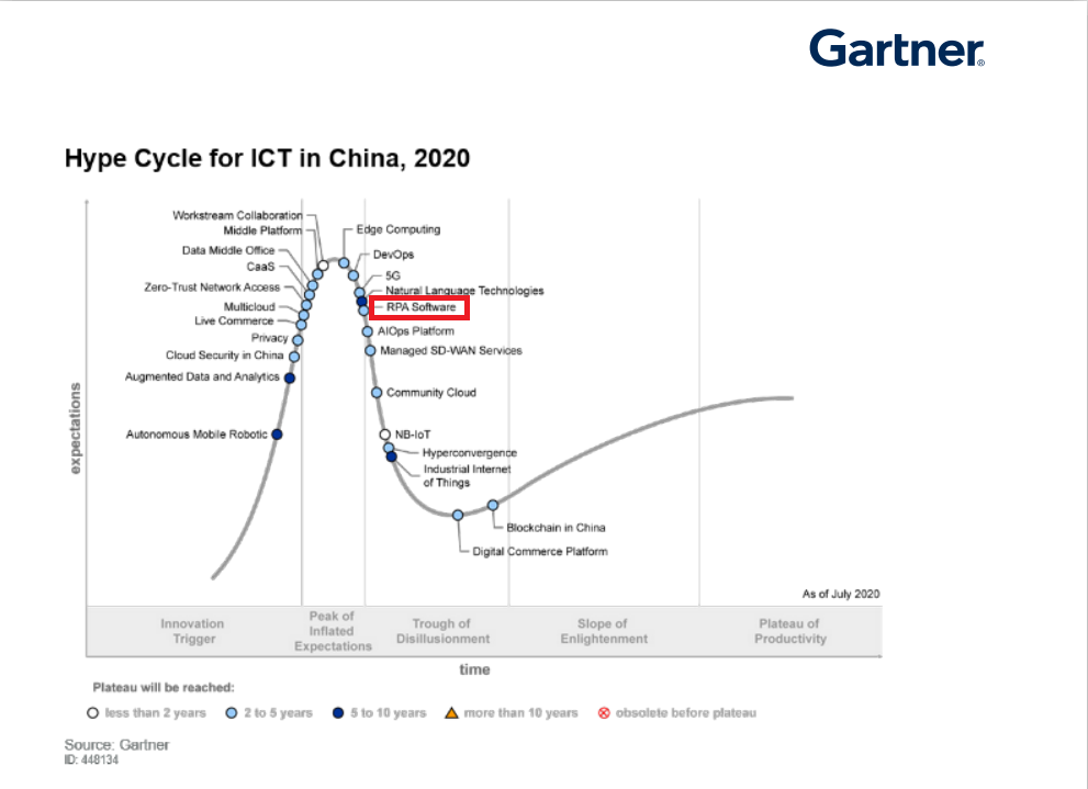 在 2020 年的中国信息与通信技术(ICT)技术成熟度曲线中,Gartner 选择了包括5G、机器人流程自动化(RPA)、AIOps平台、多云、云安全、边缘计算、开发运维、电商平台等在中国市场有重大发展价值及关注度较高的技术进行分析, 研究发现,人们对RPA的兴趣仍然处于急剧上升的时期。