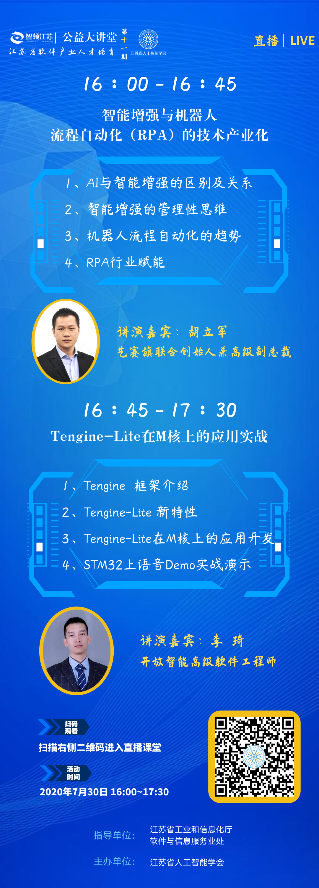 “智领江苏”公益大讲堂,是在江苏工业和信息化厅软件与信息服务处指导下,由江苏省人工智能学会联合多方创新资源,重磅打造的线上精品课程平台,其通过开展主题讲座、学术讨论、项目展示、交流互动、资源对接等活动,着力构建具有重要影响力的人工智能生态圈。大讲堂还将组织智能领域专家、学者,旨在面向组织管理者、从业者,探讨组织如何受益于人工智能,及探索人工智能的商业价值。