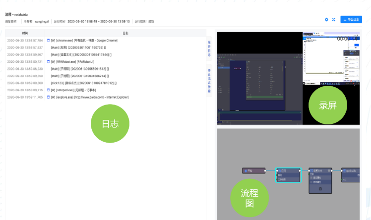 与此同时,为满足机器工厂的合规性,艺赛旗在服务端,通过录屏、日志、流程图等三联播放的形式,展现机器人流程开发运行的全过程,满足了机器人工厂的回溯及审计合规需求。