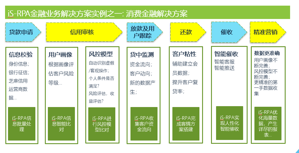 消费金融端的效率提升、风控改善、贷前贷中贷后全流程都需要新的技术来提升用户体验,在消费金融业务链中,艺赛旗RPA的介入点,也是非常的多,而RPA的机器人工厂解决方案,对于消费金融的综合服务能力提升也将是一个助推器。