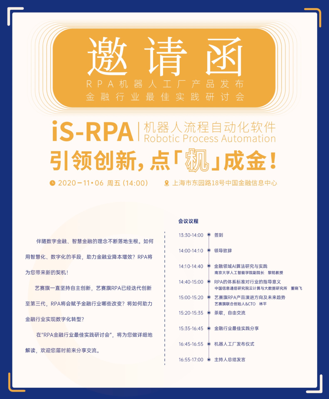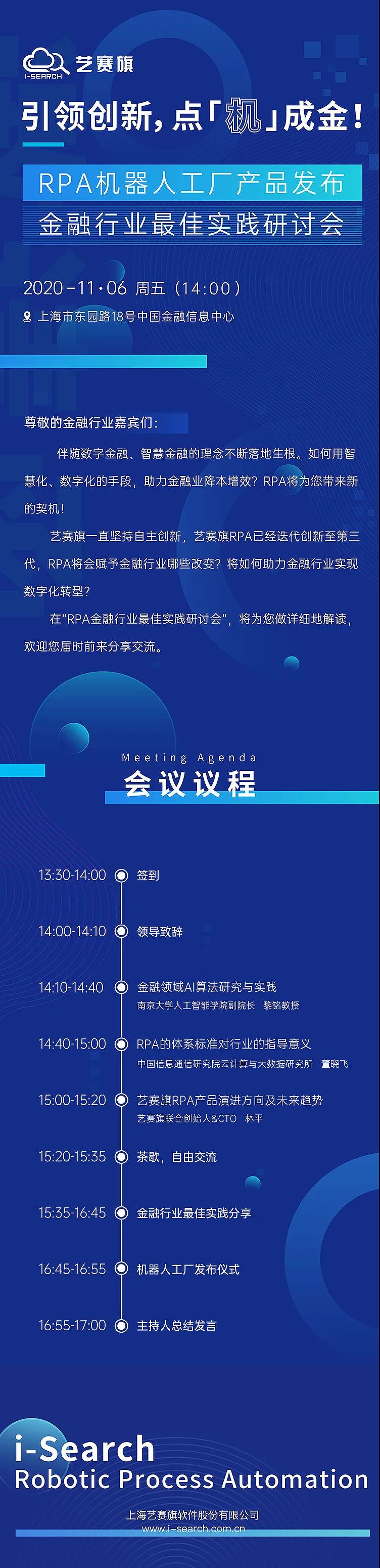 艺赛旗将于2020年11月6日在上海市东园路18号中国金融信息中心举办 「 RPA金融行业最佳实践研讨会」,特邀金融行业客户参会。