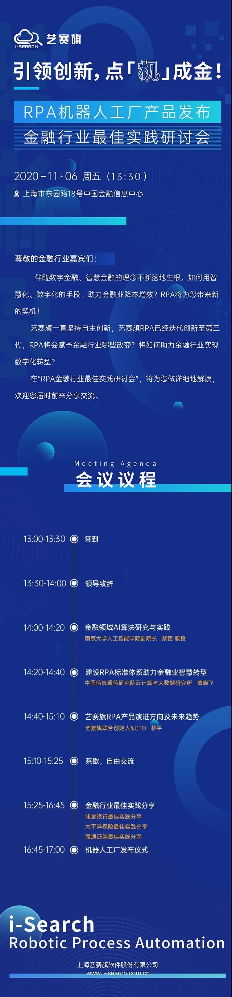 “RPA金融行业最佳实践研讨会&RPA机器人工厂产品发布”,作为艺赛旗2020下半年金融行业重要会议,将于11月6日在中国金融信息中心如期召开,