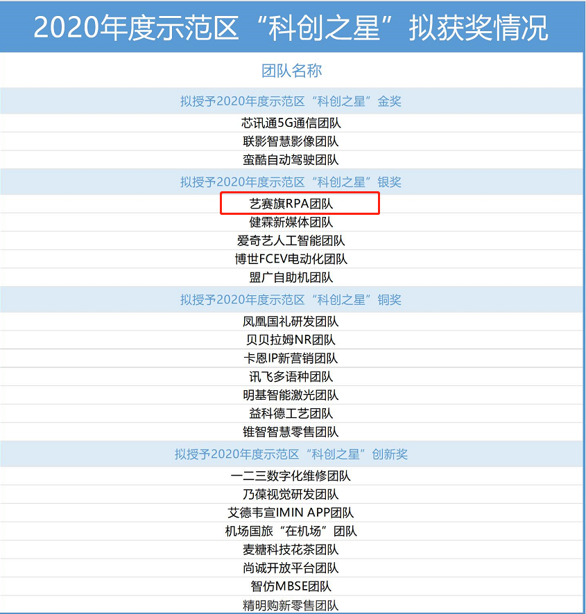 此次评选中,2020科创之星评选组委会,对全部候选机构在科技创新等方面的突出表现进行综合评估。艺赛旗自参与评选以来,一路乘风破浪,在产品与创新之间稳健搭起“高速通道”,不断推动流程自动化产品的迭代创新,在行业内的综合表现得到了评选组委会的一致认可,荣获2020年度示范区“科创之星”银奖。