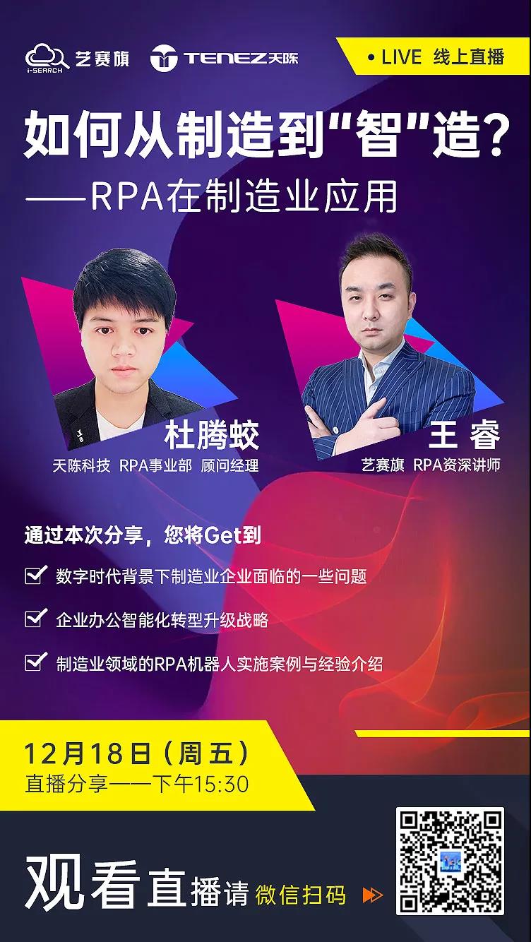 请扫码观看——12月18日(周五)下午15:30由艺赛旗RPA和金牌合作伙伴TENEZ天陈科技公司带来的直播。