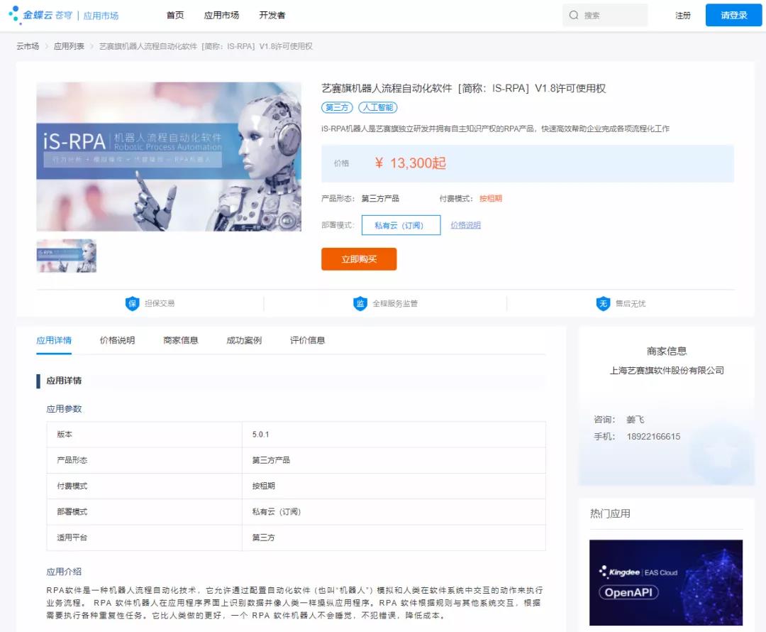 你可以更方便的在金蝶应用市场上购买艺赛旗iS-RPA产品使用。