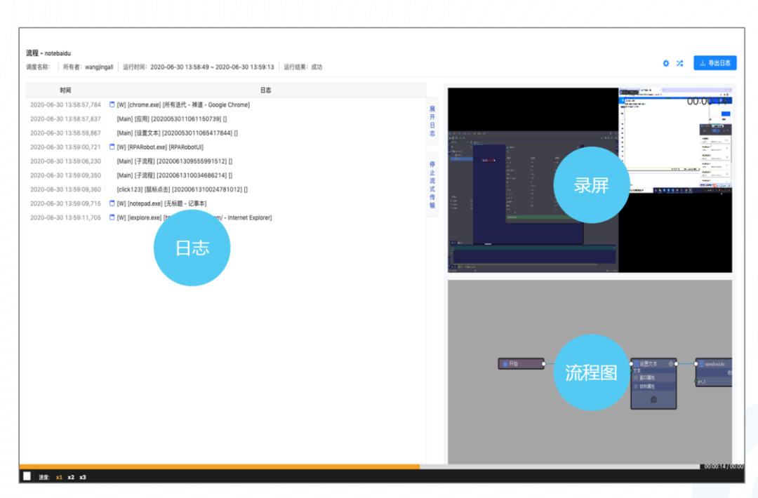 为了保证整个自动化流程的运行安全,还提供了流程回溯——三联播放。这是一个将设计器日志、流程运行录屏及设计器画布关联,一体化同步回溯流程运行全过程。支持定位回放录屏、日志导出、流程分享等功能。