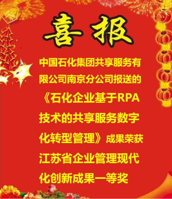 12月22日,由江苏省企业联合会、省工信厅、省国资委共同主办,江苏省企业管理现代化创新成果审定委员会负责组织开展的第二十七届江苏省企业管理现代化创新成果审定工作圆满结束。经江苏省政府部门、高等院校、社会团体有关专家的初审、预审、指导、终审、公示五个程序,中国石化集团共享服务有限公司南京分公司报送的《石化企业基于RPA技术的共享服务数字化转型管理》成果在131项申报成果中脱颖而出,荣获“江苏省企业管理现代化创新成果一等奖”!恭喜中国石化集团共享服务有限公司!