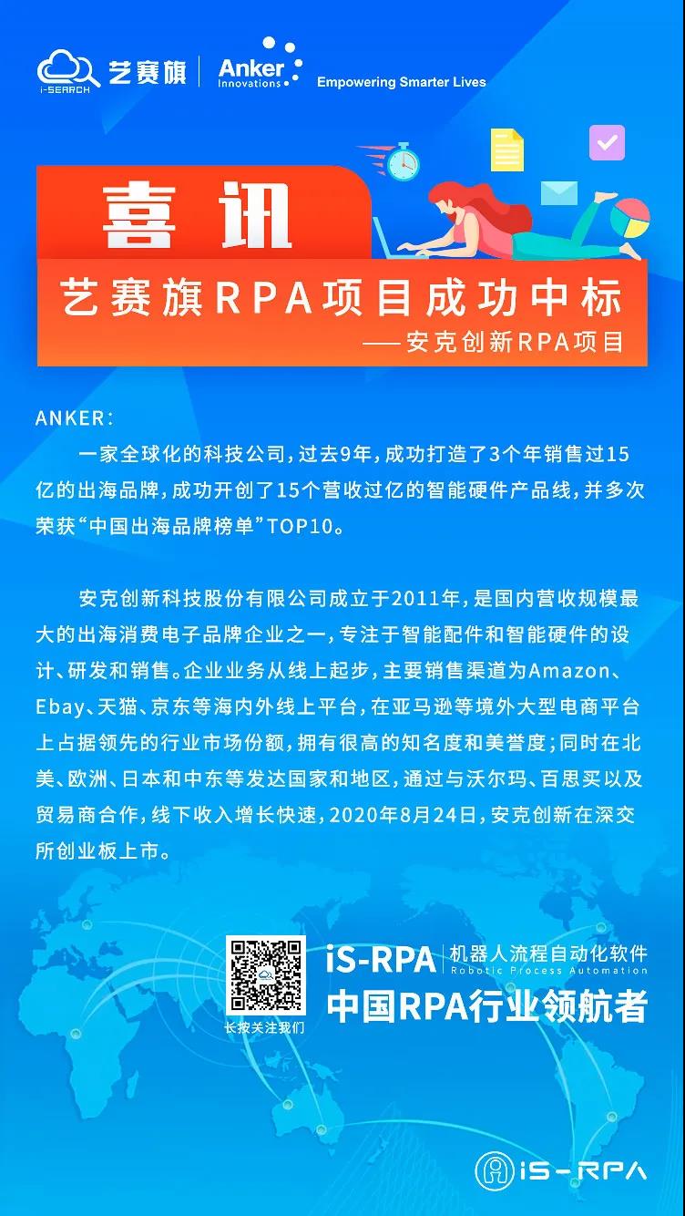 近日,公司取得跨境电商及消费电子行业RPA项目重大突破,成功中标“安克创新RPA项目”。