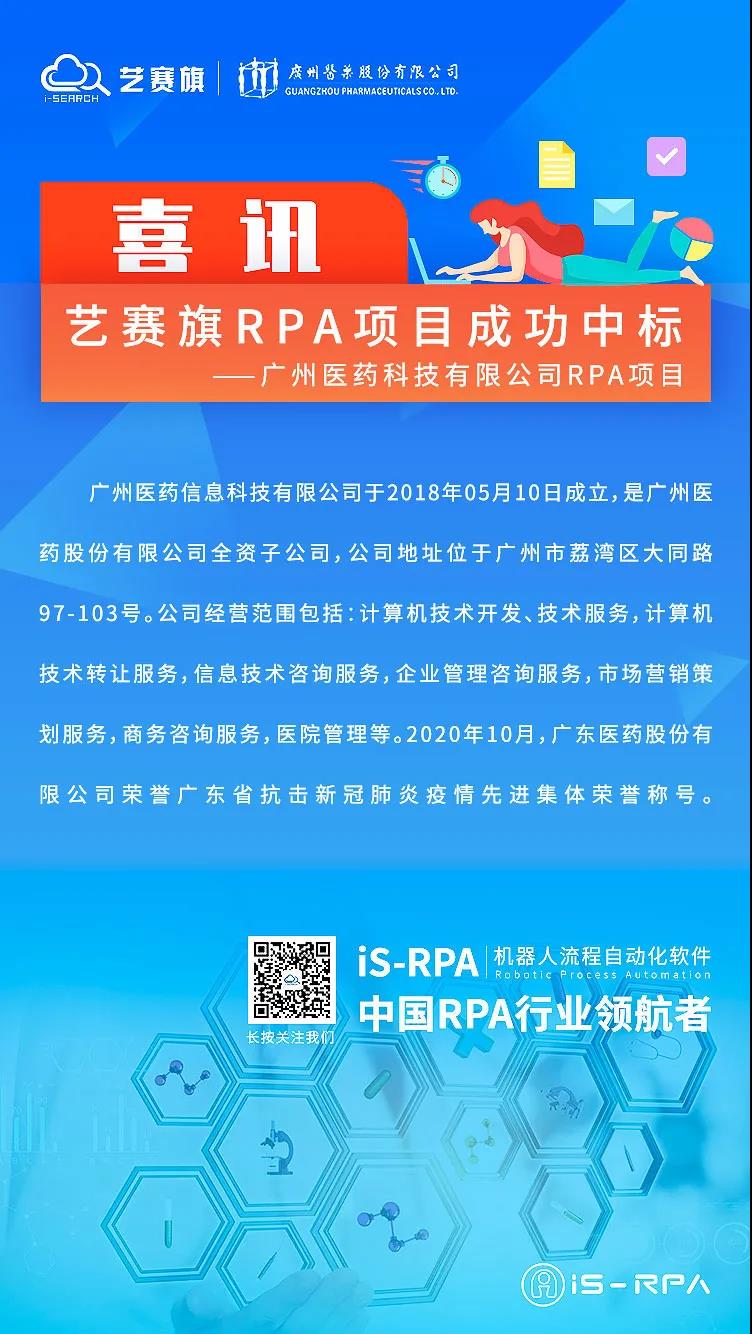 近日,艺赛旗取得医药制造业行业客户重大突破,中标成为广州医药信息科技有限公司(广州医药股份有限公司全资子公司) RPA供应商。
