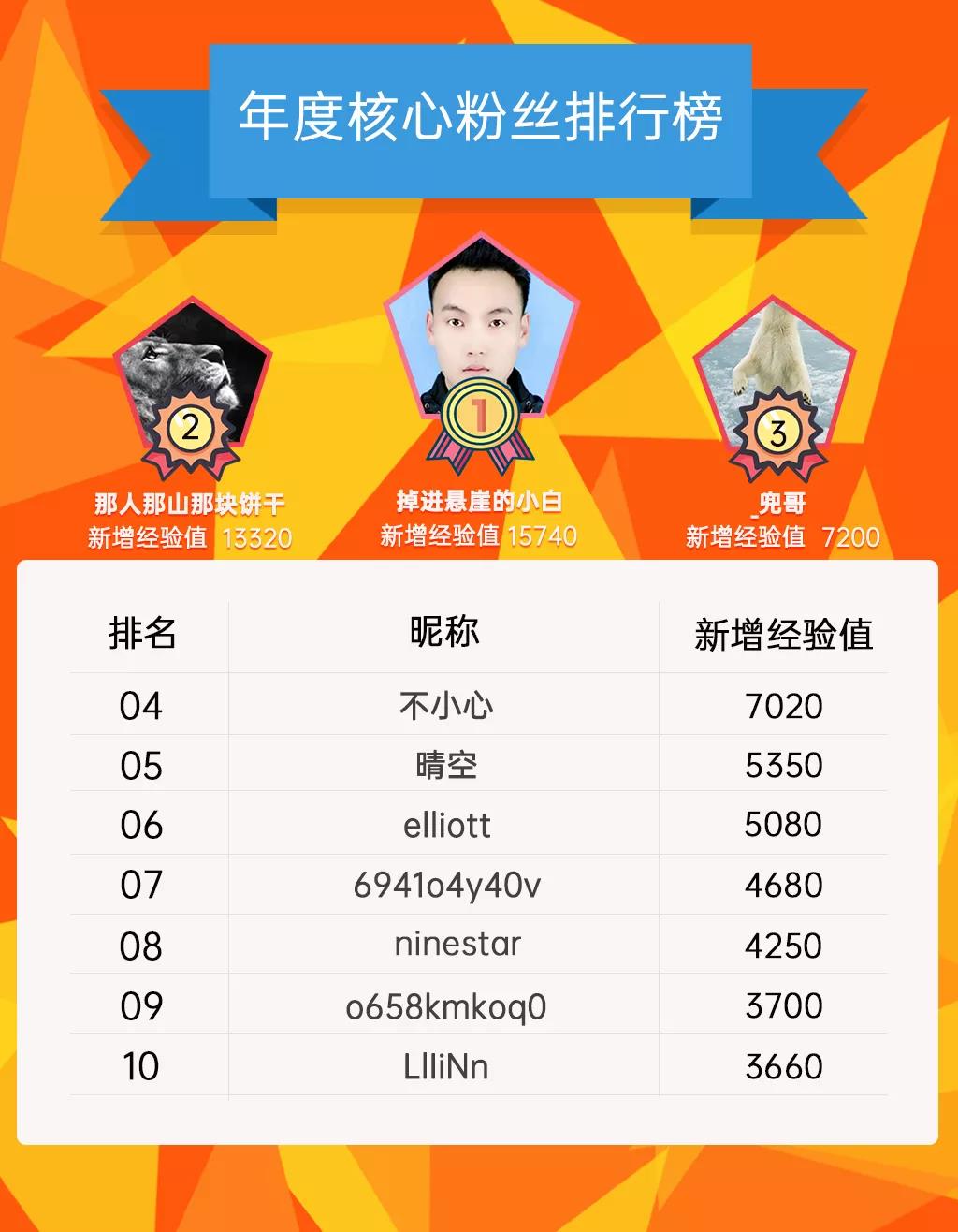 让我们看看2020年年度的核心粉丝榜单,上榜的小伙伴可以去找客服小姐姐领取奖品啦~(评选为年度核心粉丝的小伙伴可获得40000Y币哦)。