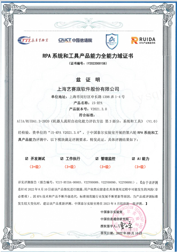 获得专业机构RPA评测认证, 标志着公司在软件研发、项目管理、运营管理水平等达到了一个新的水平,未来艺赛旗将持续深耕产品技术能力,提高软件研发和管理能力,为客户提供更优质的产品及服务!