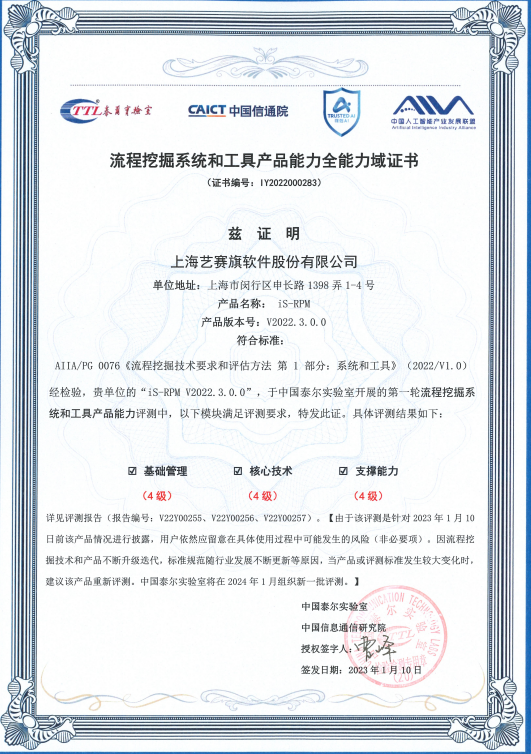 2022年9月,中国信通院启动了流程挖掘首轮评测工作,评测项目包括管理能力、技术能力、支撑能力三大方向。艺赛旗流程挖掘产品顺利完成了全部的测试项目,成为国内流程挖掘行业首批获得流程挖掘全能力域证书的企业。充分验证了艺赛旗机器人流程挖掘产品iS-RPM在流程挖掘领域的先进性、成熟度和安全性。
