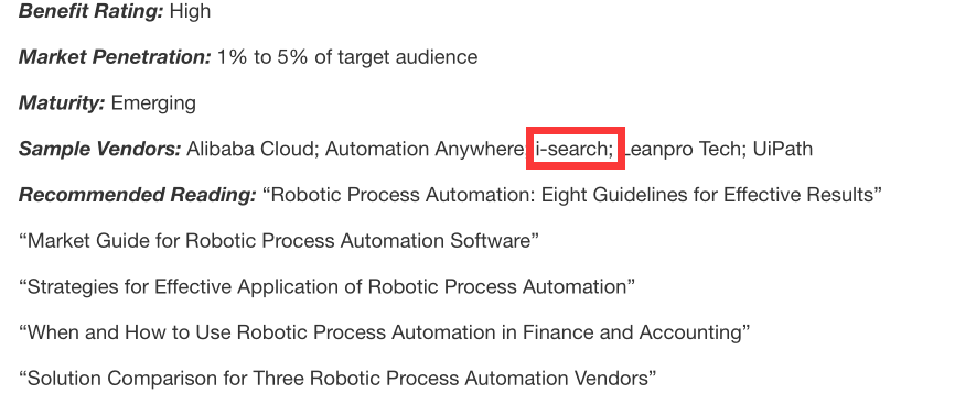 As a leading enterprise in China's RPA industry, i-Search has been selected as a "Sample Vendors" in the Gartner Technology Maturity Curve Report RPA field with iS-RPA product solutions.